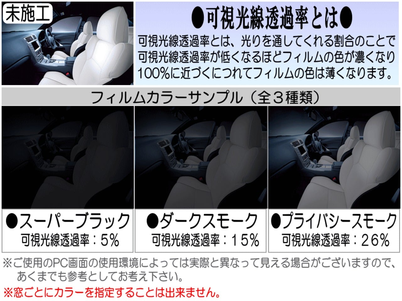 可視光線 透過率 (フィルムの濃さ/カラー) は以下三種類。