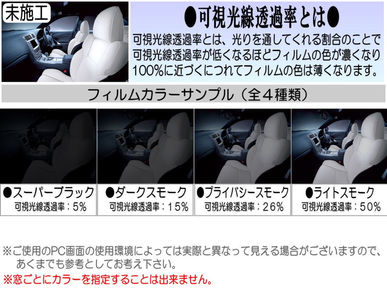 可視光線 透過率 (フィルムの濃さ/カラー) は以下三種類。