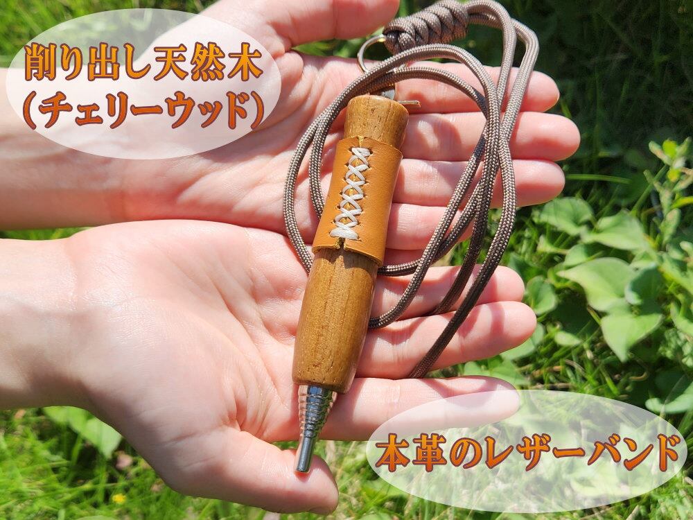 持ち手には職人削り出しの天然木のチェリーウッドを使用し、手作りで編み込んだお洒落なレザーバンド。
